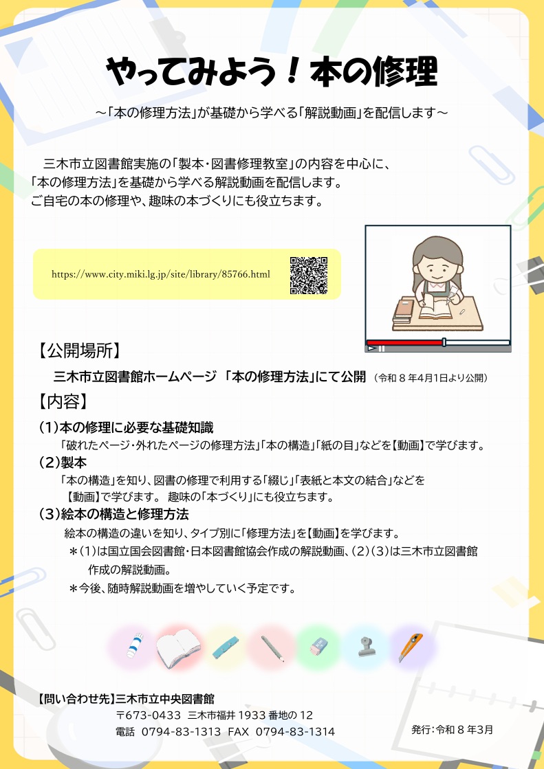 三木市立図書館では、壊れた本を図書修理ボランティアが修理しています。ここでは、三木市立図書館実施の「製本・図書修理教室」の内容から、「本の修理に必要な基礎知識」「製本」「絵本の構造と修理方法」が学べる解説動画を配信します。初心者の方でも学べるように「テキスト」を添付、ダウンロード、印刷することができます。
