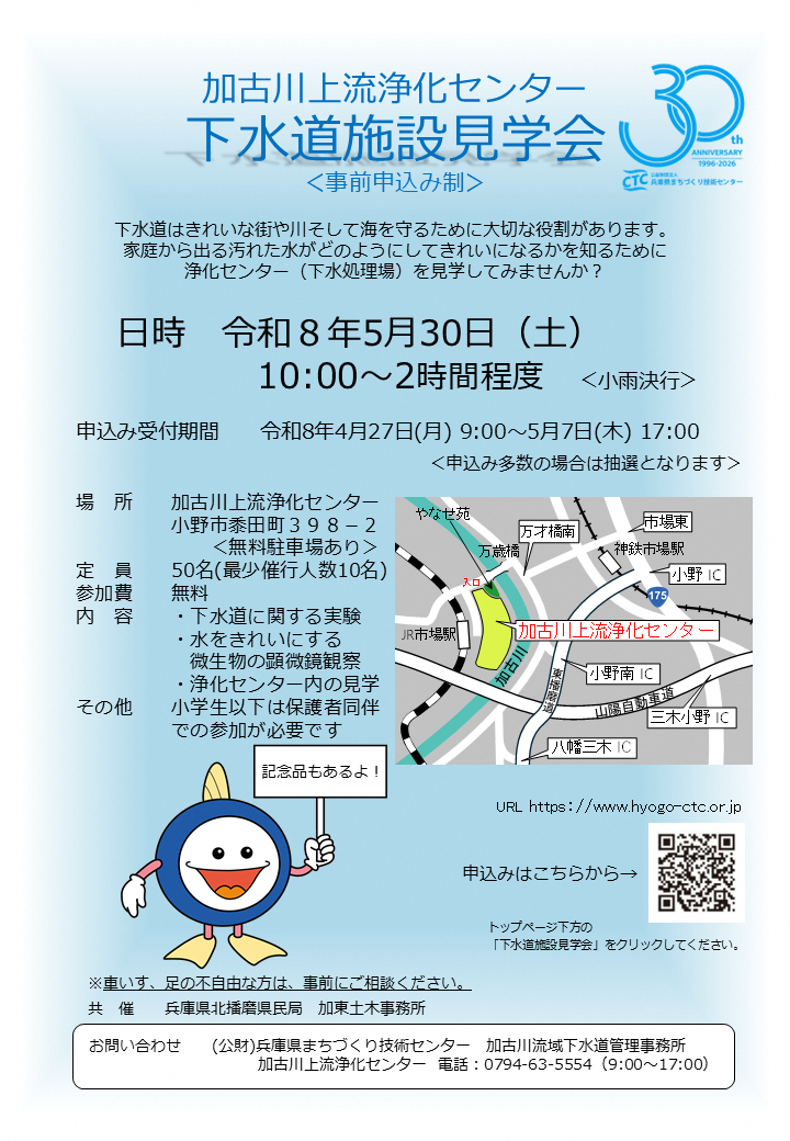 加古川上流浄化センターにおいて、下水道施設見学会が開催されますので、お知らせします。